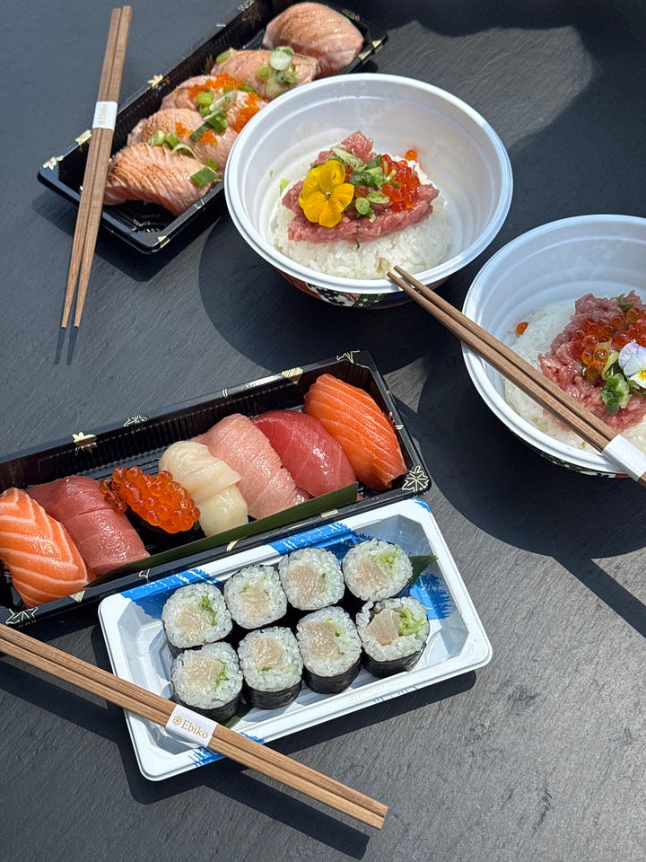 Pick up lunch from Ebiko (order ahead, my favorite things to order are the hamachi + green onion, and their omakase flight)